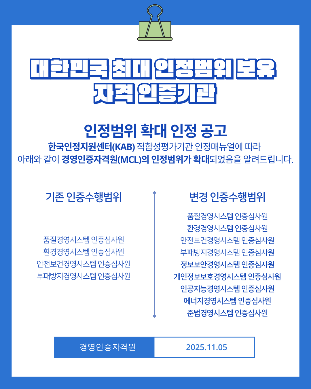 신뢰받는 자격인증을 관리하기 위해 MCL은 더 나은 서비스를 제공하기 위해 노력하겠습니다.